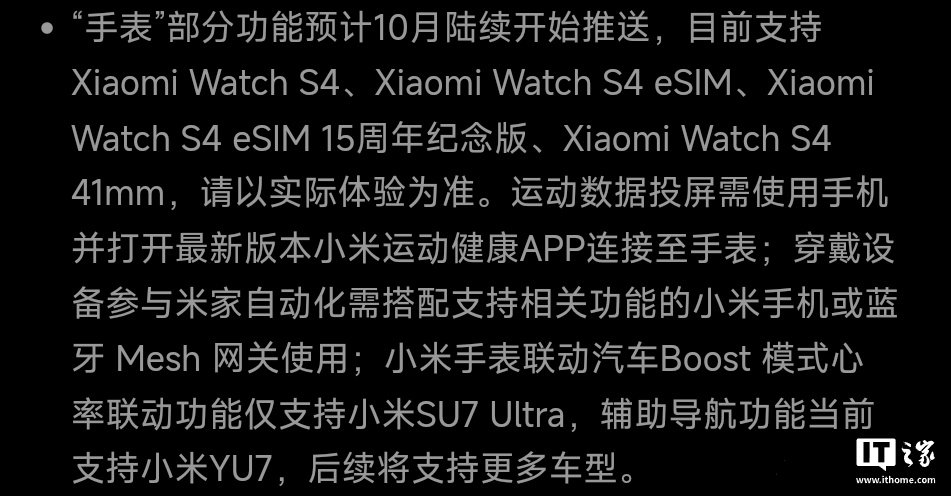 据小米产品总监 MIUI / HyperOS 体验总负责人金凡介绍,辅助导航功能当前支持小米 YU7,新增体育赛事预约、澎湃 OS 3 系统“手表”部分功能预计 10 月陆续开始推送,二维码、官方在发布会的最后公布了 Beta 版推送计划。小米官网显示,